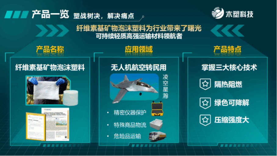 团队利用纤维素-膨润土协调相互作用,通过环境干燥、简单、经济和环保的方法成功制得可降解的生物质塑料泡沫。该可降解生物质塑料泡沫不仅生产工艺简单、低碳环保,而且压缩强度大,水稳定性好,隔热且耐高温。团队与郑州纵凌苍穹无人机科技有限公司展开合作,首次尝试将纤维素基复合矿物泡沫推向航空产业市场,在重量、强度和价格之间取得了较好的平衡,并且适合多种方式的加工。