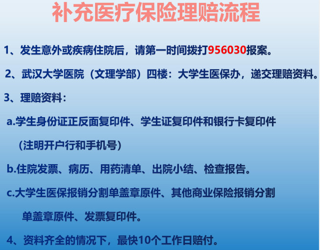 时间:周一到周五上午;地点:大学生医保办公室-文理学部校医院4楼 027-68761070;