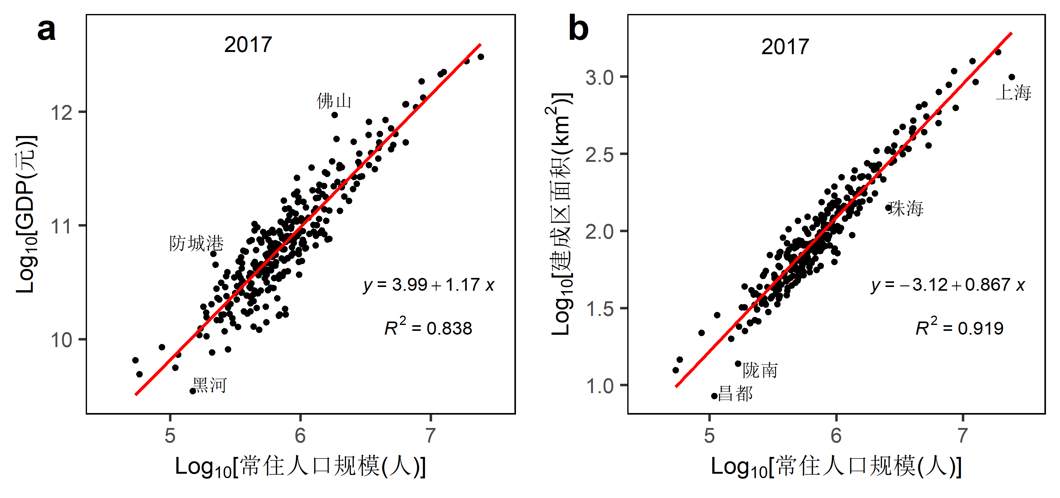 图2 中国地级市GDP和建成区面积与城市人口规模的标度律