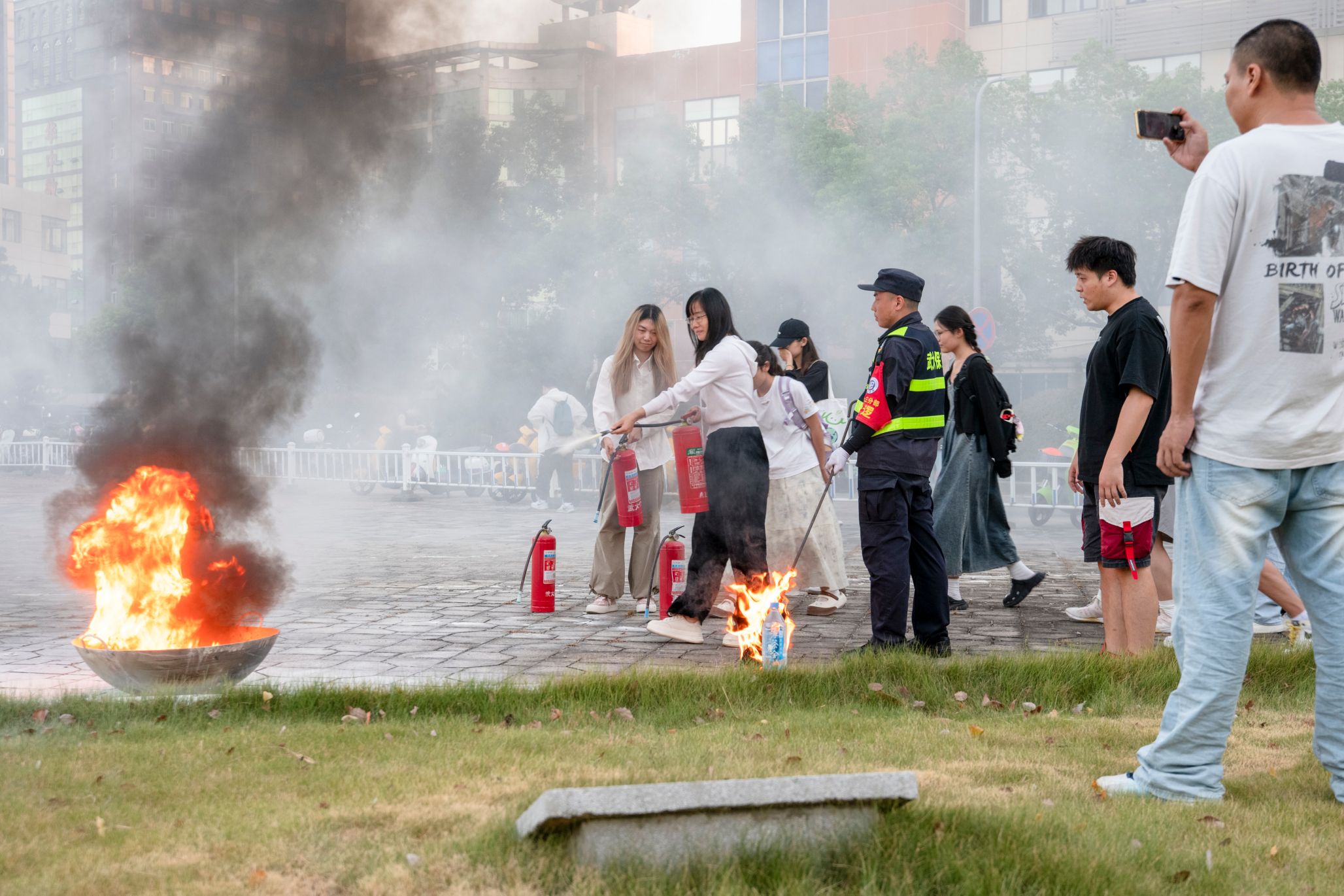随后,在学校友谊广场上,邀请了学校保卫部三分部同志指导开展了消防实操演练,每位参训者均进行了干粉灭火的实践体验。