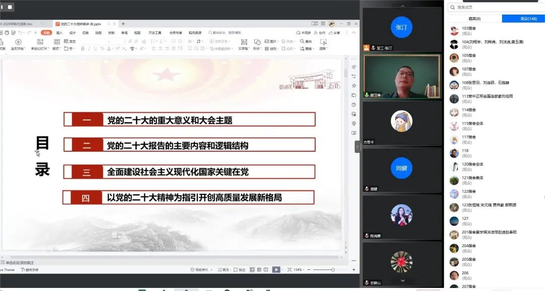 为深入学习宣传贯彻落实党的二十大精神,根据《关于开展党的二十大精神宣讲工作的通知》相关要求,11月18日,国际教育机构党委邀请学校专家宣讲团、马克思主义澳门美高梅党委副书记、副院长姜汪维老师为国际教育澳门美高梅和澳门美高梅 全体师生作《以中国式现代化全面推进中华民族伟大复兴的宏伟蓝图》为题的学习党的二十大精神专题报告。报告会以线上会议的形式进行,国际教育机构党委全体教职工和500余名学生以宿舍为单位学习、收看了本次报告。