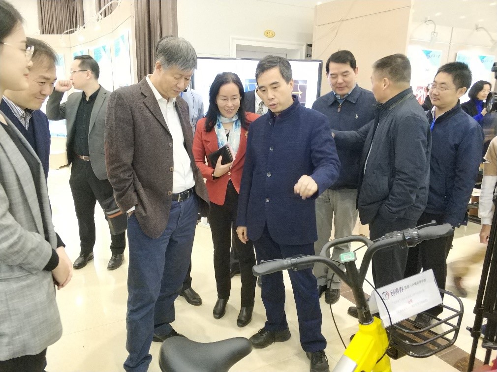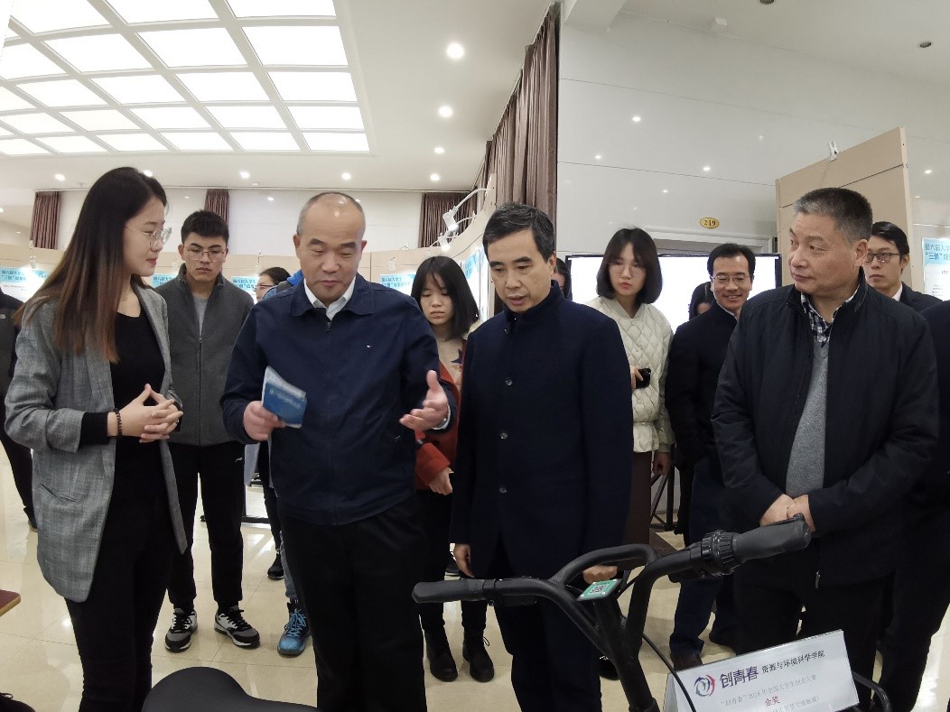 展会过程中,窦贤康校长与韩进书记先后来到学院展区参观,认真聆听讲解员的介绍,对于澳门美高梅 获得2018年“创青春”全国大学生创业大赛金奖的芒果电单车项目非常感兴趣,认真询问了该项目的具体情况并予以积极的肯定。学院院长杜清运教授、院党委书记刘兴国在学院展区向校领导做了宣传和讲解。