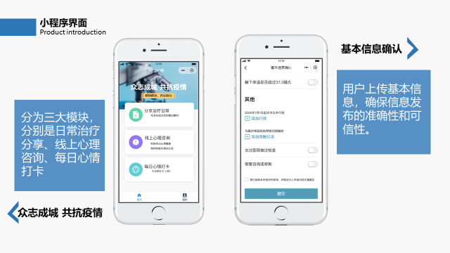 灾难不仅禁锢身体,也戕害心灵。此次疫情带来的心理伤害,比我们意识到的更严重和普遍。通过收集“疫情心理健康报告”、一月中旬疫情爆发以来的网络舆情信息,分析了目前人们的心理状况。设计了“壹心抗疫重建珈园 ” 心理健康互助平台小程序,提供日常治疗分享、线上心理咨询、每日心情打卡三大模块。