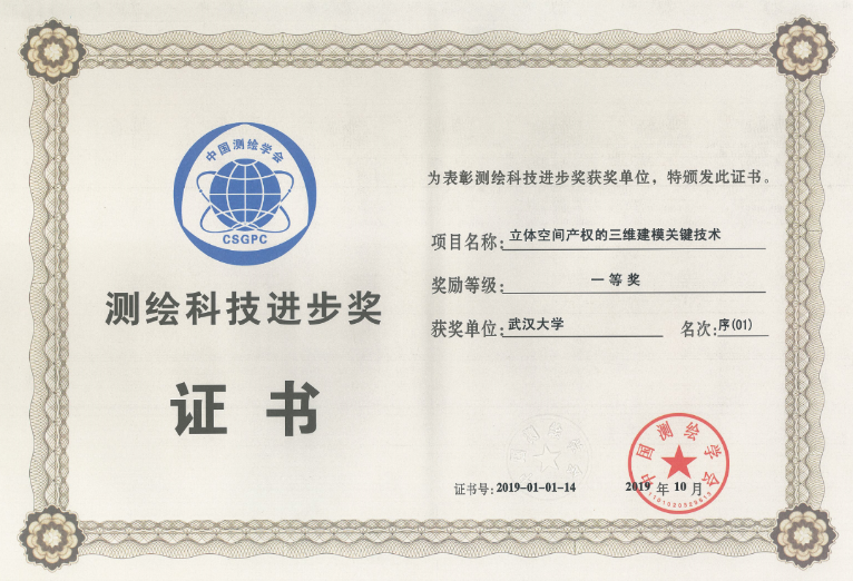 2019年10月16日,以 “创新融合智绘未来——测绘服务生态文明建设”为主题的中国测绘学会60周年暨中国测绘学会2019学术年会在江苏南京举行,大会颁发了测绘科技进步奖等重要奖项。由澳门美高梅 李霖教授团队的应申教授主持申报的“立体空间产权的三维建模关键技术”项目荣获测绘科技进步一等奖,项目主要参与人(澳门美高梅 )有应申、李霖、朱海红、苏世亮。