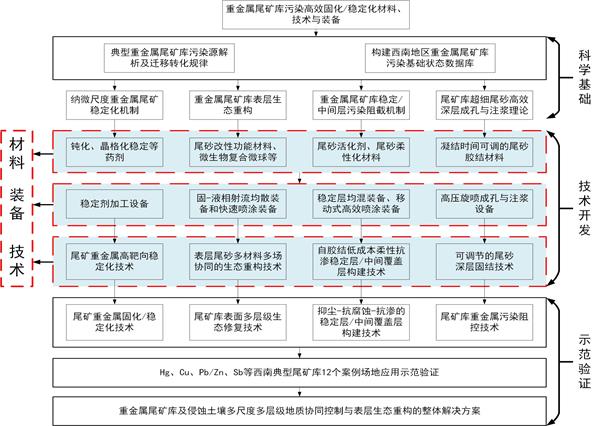 项目目标:项目选取西南地区铜矿、铅锌矿、镍钴矿、锡矿、汞矿、砷锑矿、铬矿等典型矿种,针对尾矿中Pb、Hg、Cd、Cr、As、Cu、Zn、Sn、Ni、Sb等重金属开展:尾矿库重金属迁移转化行为、重金属多尺度多层级污染阻控机制、尾矿库表土生态重构机制等重大科学问题的研究;基于尾矿分级分类处置的尾矿高效稳定化环境功能材料、尾砂自胶结、高压旋喷灌浆、尾矿库结构优化、表土生态功能重构等关键共性技术及装备研发;通过典型矿种尾矿安全处理处置与生态重构的集成示范,开发出适合西南重有色金属尾矿及尾矿库重金属污染高效阻控以及表土生态功能重构的新理论和技术;最终通过集成与示范验证形成可复制、可移植、经济高效的重金属尾矿安全处置及侵蚀土壤修复整体解决方案。
