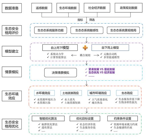基于RS、GIS的多门类自然资源调查评价及监测技术方法对长江武汉段的水资源、湿地等生态环境环境进行调查分析,构建区域生态安全格局评价分析系统。应用系统动力学、计算智能算法和元胞自动机技术,耦合“自上而下”和“自下而上”的区域城市土地利用演变模拟系统,发展城市增长生态环境影响的情景模拟技术,重点评估未来城市增长和土地利用变化对湿地保护、水生态保护、水环境等方面的生态效应。利用空间优化技术对未来城市增长和土地利用变化对区域的水资源、湿地等生态资源进行生态安全格局优化,从而实现未来区域的可持续发展。研究的技术框架如图1。