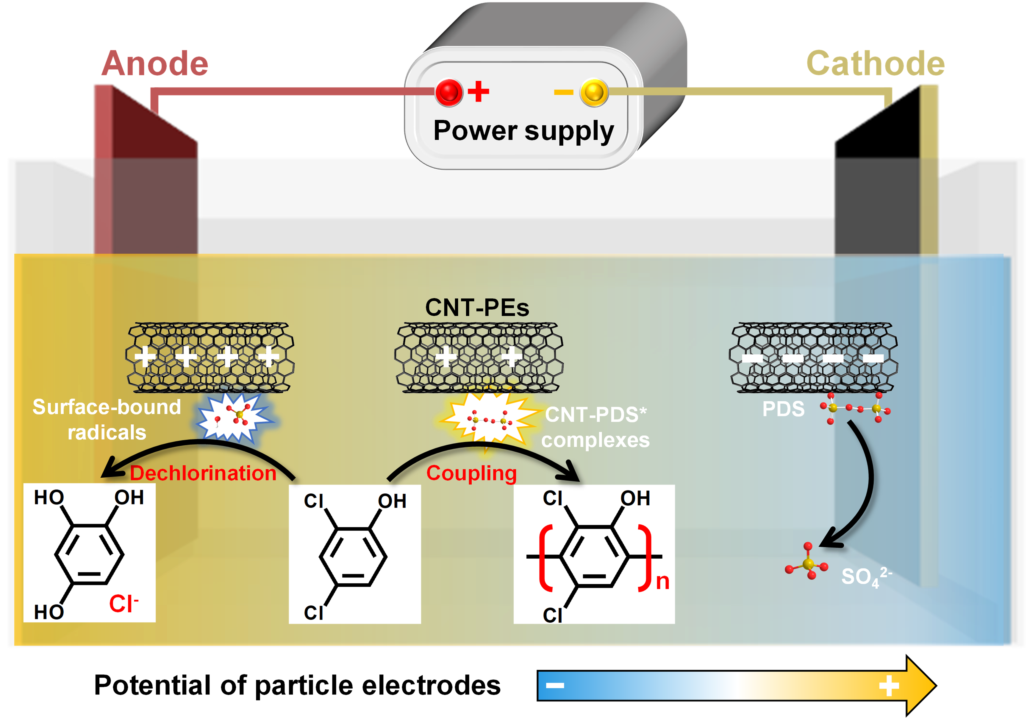 碳/过硫酸盐体系被誉为高效的绿色水处理技术,它在复杂的水质条件下也能快速地将有机污染物去除。然而,大部分碳材料在循环使用过程中难以维持高效的活性,从而极大地限制了碳基过硫酸盐技术的实际应用。目前,常用恢复碳催化剂活性的方法有热处理法、紫外辐射法、萃取法和电化学法。据报道,电化学法可以在阴极有效地还原碳材料表面的活性官能团,从而维持碳材料的催化活性,同时还能有效地活化过硫酸盐降解有机污染物。在电化学高级氧化过程(EAOPs)中,有限的电极活性表面积导致污染物向电极的传质过程成为其速率限制步骤。为此,我们将传统石墨电极与碳纳米管(CNT)耦合,构建了三维EAOP体系。电极(尤其是阳极)诱导电场使CNT自发极化为粒子电极(CNT-PEs),从而促进过氧化二硫酸盐(PDS)的电化学活化,生成表面CNT-PDS*复合体及固相自由基(SBRs)。根据所处电场中的位置,CNT-PEs可分为以下三个过程:(i)CNT-PEs的激发电位小于有机物氧化电位(即ECNT-PEs < Eorganic),CNT-PEs难以氧化二氯酚(DCP);(ii)当Eorganic < ECNT-PEs < Ewater,CNT-PEs将通过电子转移过程(ETP)来实现DCP的氧化;(iii)当ECNT-PEs > Ewater,CNT-PDS*复合体和阳极都会氧化水产生催化剂表面固相自由基。因此,DCP可通过电子转移过程在CNT表面形成多氯酚,导致微电极快速失活。相比之下,固相自由基可直接将DCP氧化成氯离子和羟基化产物,在长期运行中保持CNT-PEs的表面清洁和活性。