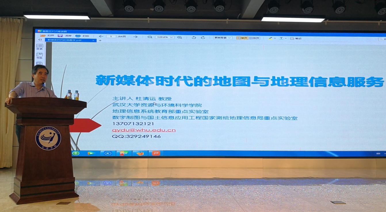 2019年4月20号, 应宜春学院的邀请,院长杜清运教授带队,地理信息与地图科学系青年骨干一行,赴江西省西北部宜春市的宜春学院地理科学系,参加学术和教学交流活动。杜清运教授给宜春学院全校师生作了题为“新媒体时代的地图学与地理信息服务”的主题报告。