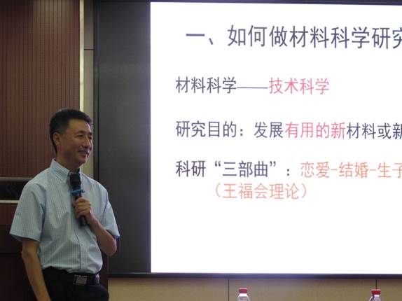 然后,王老师以“恋爱-结婚-生子”类比材料研究中“基础研究-实用研究-产业化”三个阶段,给大家分析了每个阶段的作用与目的,强调了材料科学研究的目的为发展有用的新材料或新技术。他还结合自己在纳米晶涂层、镁合金微弧氧化、涂料的化学键合三个领域的研究成果,详细阐述了从基础研究到实际应用的过程。
