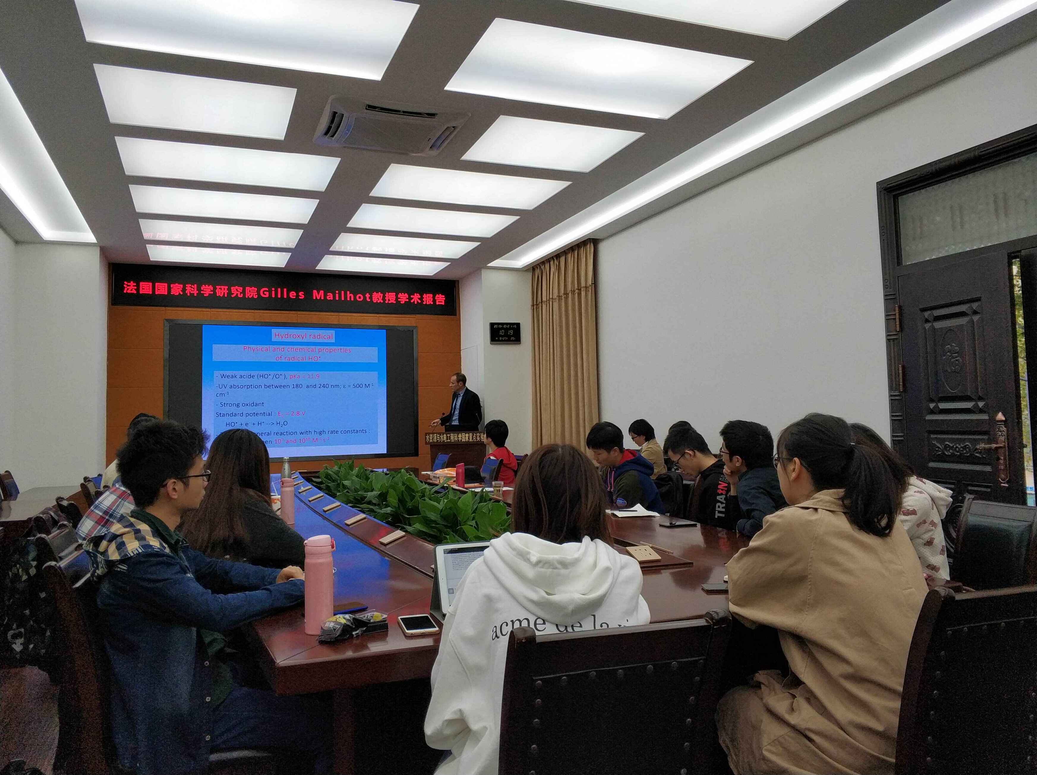 在学院交流访问期间,Gilles Mailhot教授分别于10月22日和10月25日作了2场学术报告,报告题目分别为“Use and Role of Iron in Advanced Oxidation Processes”和“Iron photochemistry: implication in the environment”。在两场报告中,Gilles Mailhot教授介绍了铁在环境中的存在形态以及在各类水体以及云雾中的含量,并结合自己团队多年来的研究成果,详细介绍了不同铁形态物质在高级氧化技术水处理和大气污染治理方面的应用以及涉及的机理。每场报告结束后,Gilles Mailhot教授都与在场师生就相关问题进行了深入的交流和讨论。