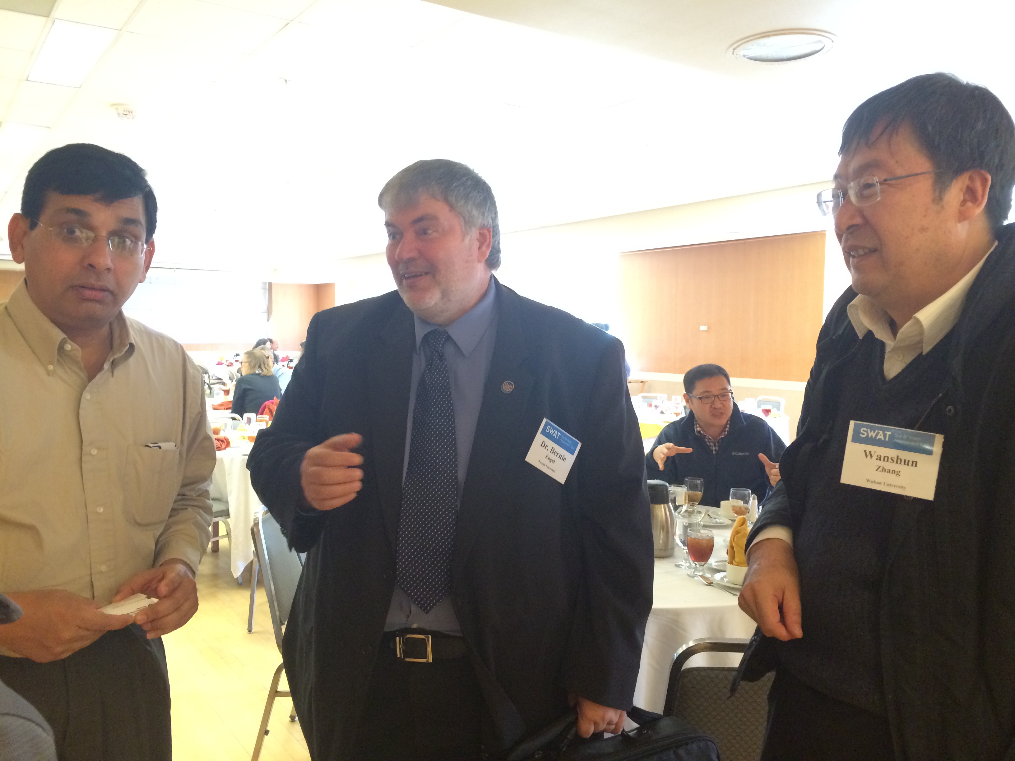 2015年10月14日-16日,2015年国际SWAT会议(The 2015 International SWAT conference)在美国普渡大学举行。本届SWAT会议吸引来自10个国家的140名学者参与。应美国普渡大学农业与生物工程系(Agricultural & Biological Engineering, Purdue University)系主任Dr. Bernard Engel邀请,澳门美高梅 张万顺教授携课题组师生5人参加了此次大会,并以口头报告的形式系统展示了课题组在三峡、梁子湖等流域应用SWAT模型的创新成果,受到与会学者的关注和好评。会上,张万顺教授与SWAT创始人Jeffrey G. Arnold等学者就SWAT模型在中国的应用和发展进行了交流,Jeffrey G. Arnold等学者期待在2016年的SWAT国际会议上能与课题组再次交流,课题组能进一步分享SWAT研究的创新成果。