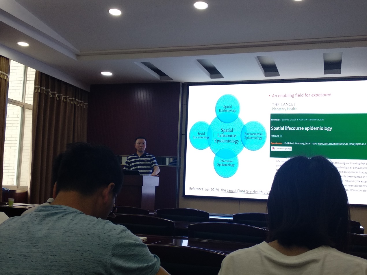 报告由应申教授主持,围绕空间生命历程流行病学展开,介绍了这门新学科的相关基础知识。重点介绍了创建这门学科的原因、目标、研究方法及其与空间流行病学、社会流行病学、生命历程流行病学、环境流行病学等其他传统流行病学的区别与联系。最后贾鹏博士展示了他本人在人口分布建模、气候变化与健康、医疗卫生规划,全球(一带一路)健康规划等方面的研究成果。