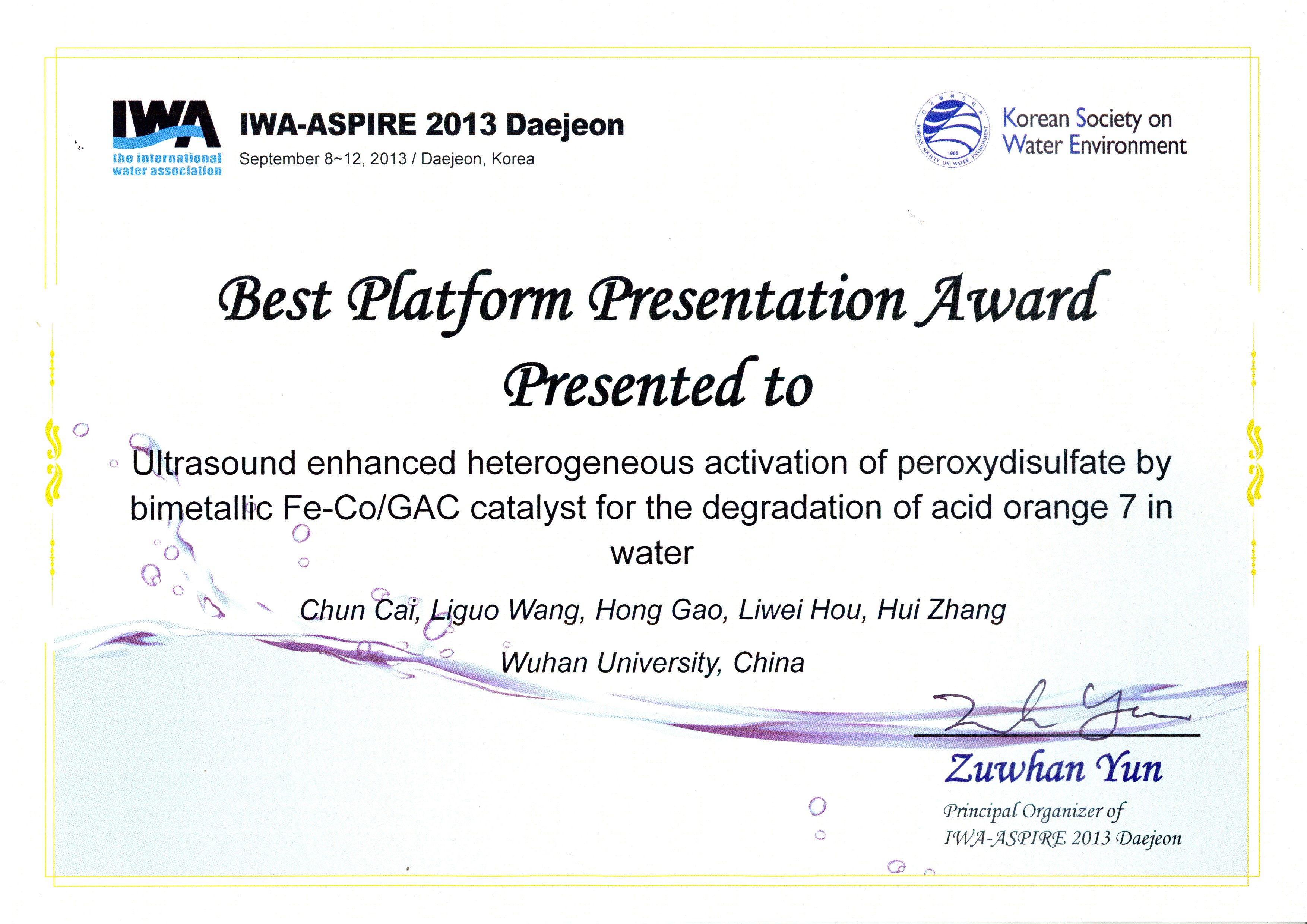 环境工程系博士生蔡纯(导师:张晖)在我校“研究生出国参加国际学术会议资助项目”的支持下,于今年9月8日~9月12日参加了在韩国Daejeon举行的“The 5thIWA-ASPIRE conference and Exhibition”国际学术大会,并宣读了2篇学术论文,其中一篇口头报告“Ultrasound enhanced heterogeneous activation of peroxydisulfate by bimetallic Fe-Co/GAC catalyst for the degradation of acid orange 7 in water”获评“Best Platform Presentation”。本次国际会议共有320篇口头报告宣读,最终有16篇获奖,其中中国4篇,分别来自香港(1篇)、台湾(2篇)和澳门美高梅 (1篇)。