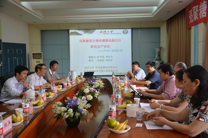 2014年9月26日,在学院会议室召开了壳聚糖基生物传感器电极芯片研发及产业化关键技术研讨会,该项目由环境科学系杜予民教授研发团队和青岛银色世纪健康产业集团公司联合承担,获得了山东省泰山学者蓝色产业领军人才团队支撑计划的资助,该研讨会就项目的研发情况及产业化过程进行了专家研讨。