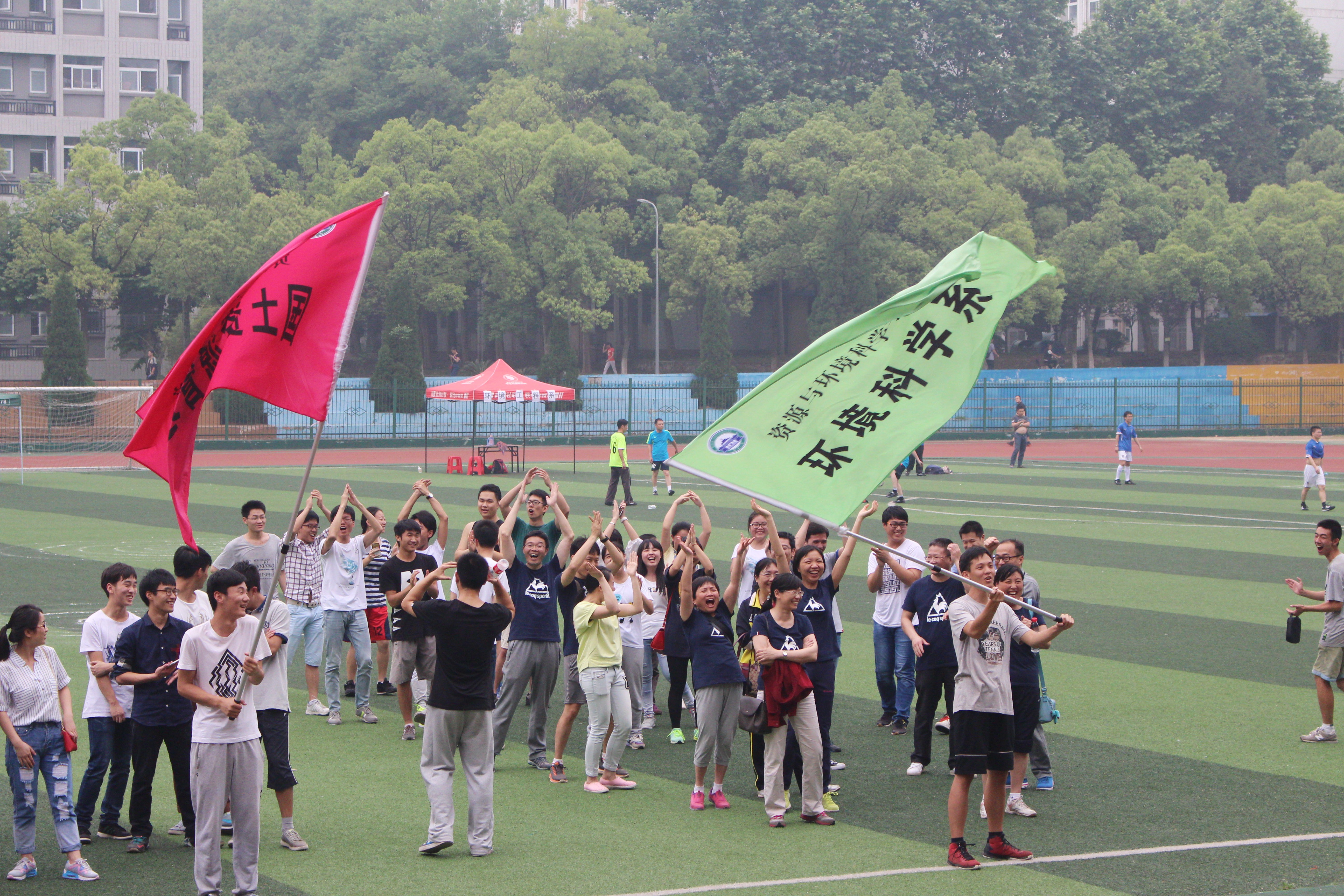 经过中午一场雨水的冲刷,下午的比赛似乎更加激烈。在跳大绳、拔河、50米迎面接力等师生混合项目中,师生们团结一致,一起为比赛商讨最佳分配方案,又一起为最后的胜利而欢呼。在跳大绳比赛和拔河比赛中,几经激烈的较量,环科系夺下两个第一。而在50米迎面接力中,制图系逆转了拔河中的弱势,以默契的配合夺得桂冠。