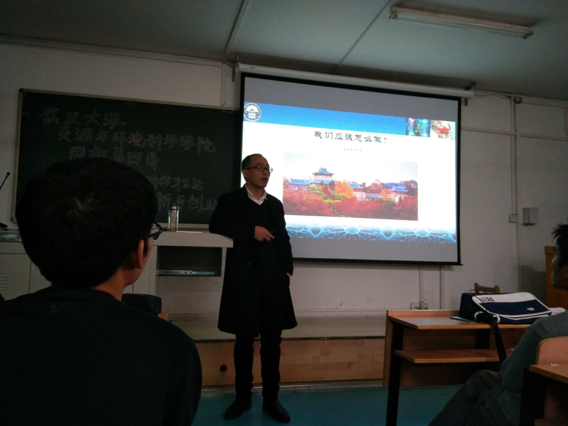 最后,邓老师着眼当下,提出了我们具体应该如何去做。他提出现今我们要追求的是创新,具有自主知识产权,为此我们需要做一个拥有无需提醒的自觉、为他人着想的善良、知识技能的储备的有文化的人,还需具有强烈的正义感,对学校的认同感和归宿感,以及不能腐化。