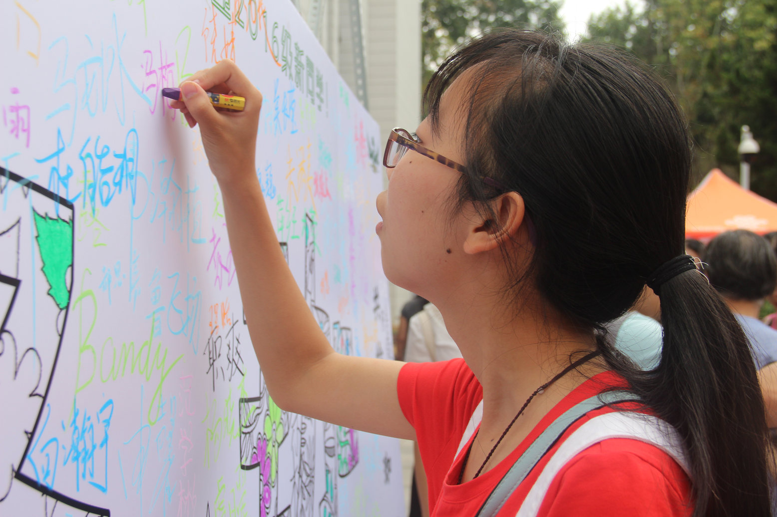 与往年不同的是,今年的迎新活动中增加了一个模块——新生们报道后即可在现场拿起彩色的蜡笔,在属于资环人的展板上为“珞珈”的枝叶添上一道鲜丽的色彩,或是在“珞珈”之旁写下自己的名字,志在于珞珈绘下属于自己的蓝图。新生们可与家长在展板前合照,共同建筑初入大学离家远行永久的回忆。此想法初由王曦阳老师提出,后在钟钰同学的改进下,将“珞珈”二字设计成小花纹的形式。“花纹里面有叶子有花,就是象征生命与活力,就是象征资环的资源与环境。”