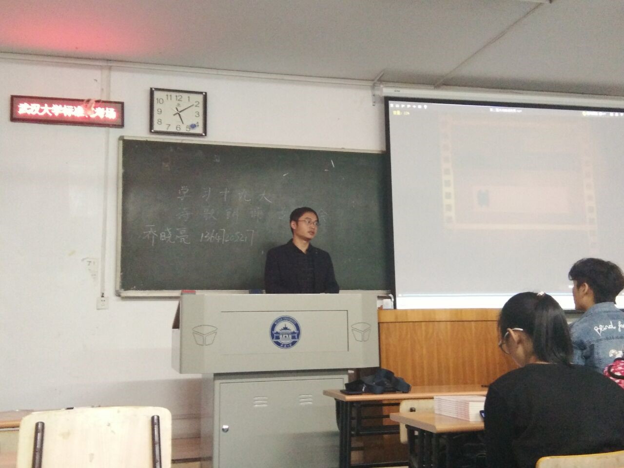 接着是乔晓亮同学的发言。乔晓亮同学是新闻传播学院16级本科生,他将在各个支部排练诗朗诵节目期间给予一定的指导。从他的发言中就可以感受到他的专业性,相信有了乔晓亮同学的指导,各个支部的表演会更加出色。