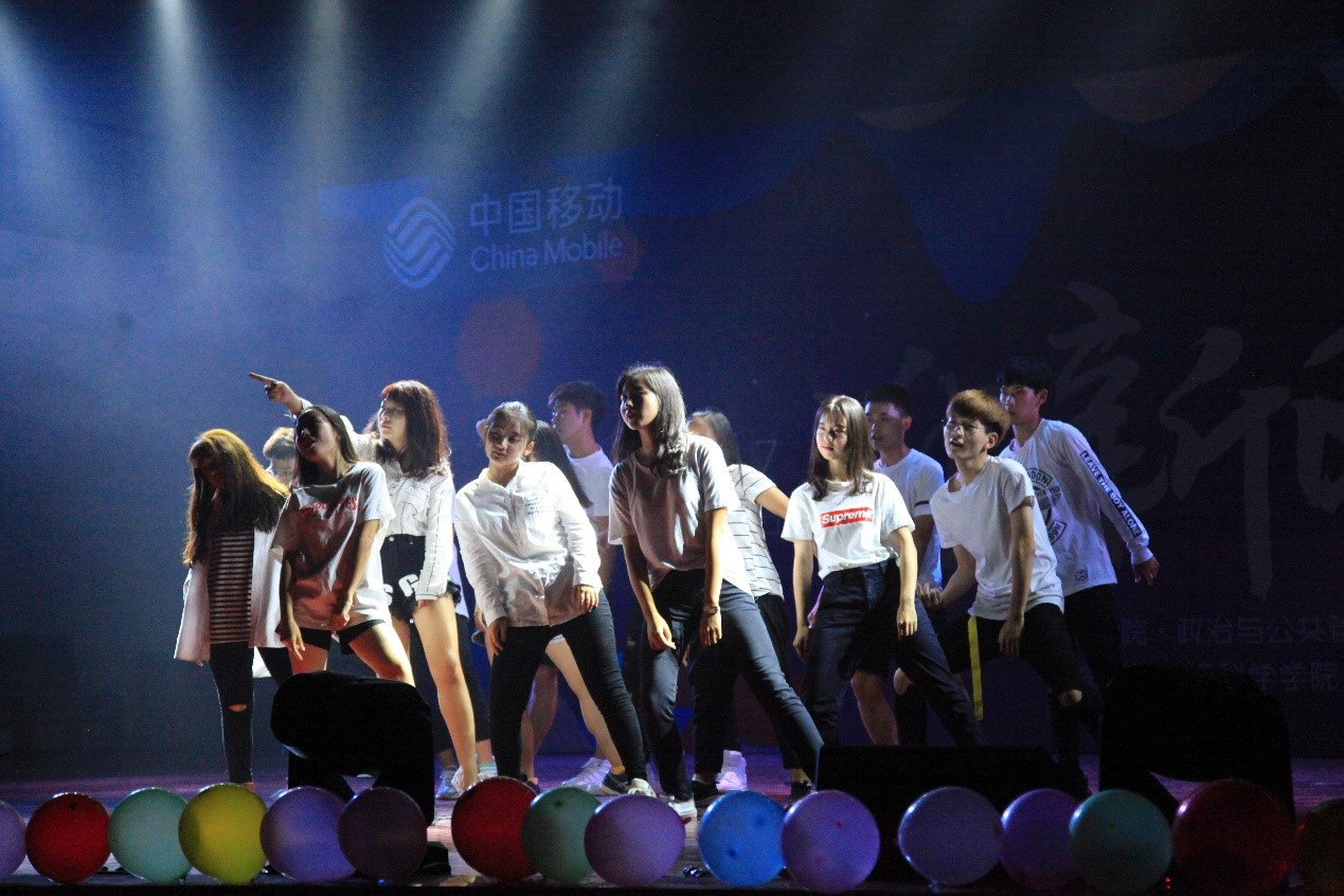 由政管院小姐姐小哥哥们带来的舞蹈《Fire》率先点亮整场晚会的火花。白色的上衣与变幻的灯光相互交织,融汇成光与影的乐章。青春的活力在音乐的鼓点与富有活力的舞步中迸发、弥漫,不自觉地召唤着同学们随着节奏挥舞手中的荧光棒。在一道道红蓝绿的光柱中,会场的气氛逐渐走向热烈。