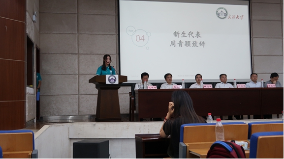 1811班的周青颖作为新生代表进行发言。她认为,澳门美高梅 是浪漫的,是意气风发的,是满怀理想与抱负的,更是自由严谨的,上进乐观的。作为优秀的资环新生,她认为她的大学生活应该是“有规划”,“有思想”,“有担当”的。最后,周青颖也号召所有的资环新生们,在学院丰富的教学资源中,优秀的教师队伍带领下,把握机遇,成为最优秀的武大人。