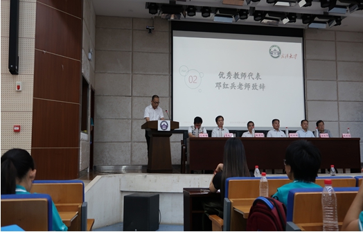 教师代表邓红兵老师用自己的经验告诉新生何为“做人,读书,交朋友”,以及如何做到这三点。邓老师以自己的求学经历及人感悟深深打动了在场的同学们,引发了同学们的思考。邓老师指出,资环学院的老师们就是指引同学们实现梦想的灯塔,无论是刻苦学习,或是参与社会活动,或是潜心科研,老师们都会帮助各位同学迈出走向成功的第一步。