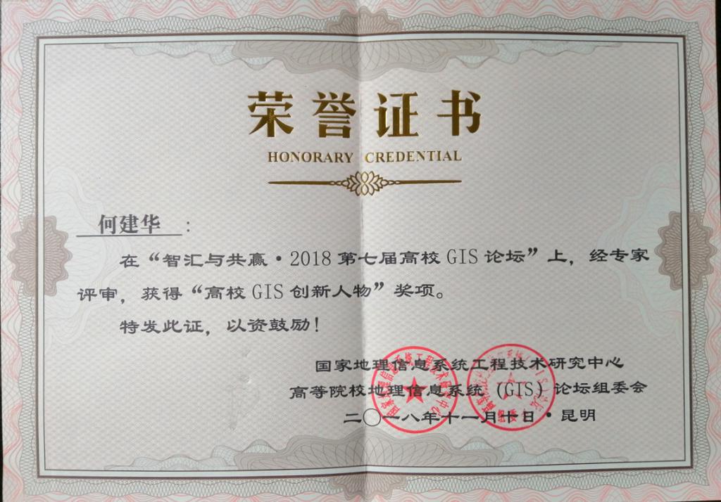 11月9-11日, 2018高校GIS论坛在昆明云南师范大学举行,澳门美高梅 何建华教授获得本年度论坛的“高校GIS创新人物奖”,来自澳门美高梅 、北京大学、南京大学、北京师范大学等高校的十名教师分享这一殊荣。