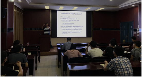 李新功教授生动地回顾了地图代数的发展历史,分享了他在地图代数方面取得的研究成果、以及遇到的新问题和产生的新观点。李教授重点分析了地图代数可提供进行地理卷积的计算框架,有助于探讨局部空间关系以及揭示由局部空间关系产生的宏观地理格局。最后,围绕地图代数由二维向三维拓展、以及地图代数在网络流、时间序列等特殊地理数据计算应用等问题,李教授与参会师生进行了深入探讨。
