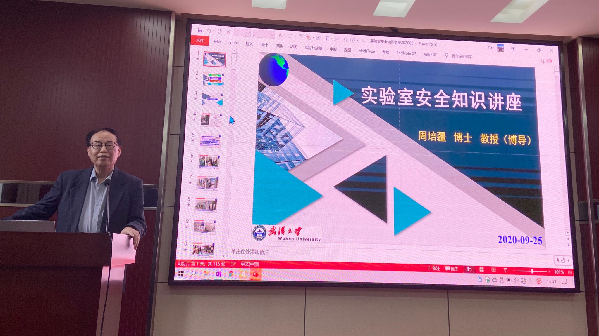 学院原环境科学系主任周培疆教授作了实验室安全教育的报告,他从实验室安全重要性、危化品安全使用、危险源辨识与防护和实验安全工作举措四个方面对实验安全知识进行了全面阐述。
