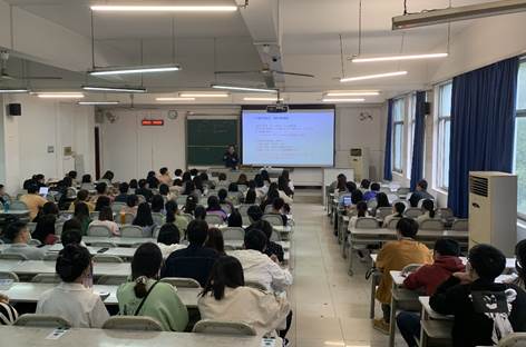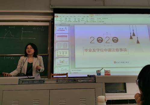 其后,教学管理办公室副主任杨妙玲讲解毕业注意事项,从毕业论文到学位申请等方面,就同学们关心的学业相关事务进行细致说明。