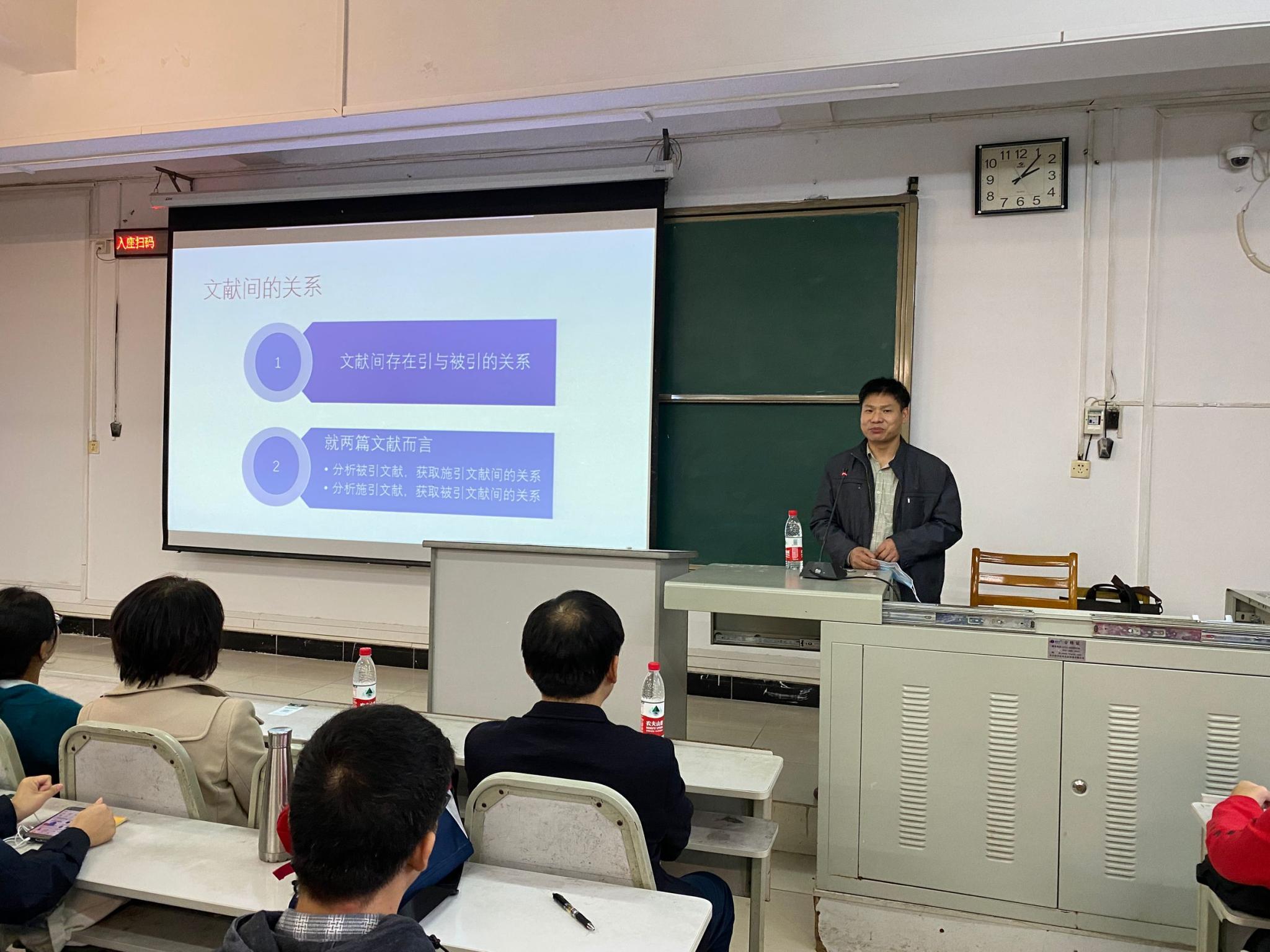 图书馆信息分馆副馆长廖祥春带来开营第一讲,他从文献间存在引与被引关系入手,为我们进行聚类分析、追溯历史相关文献和揭示热点提供了线索和依据;介绍数据库检索通用策略及差异性应对方法、选题如何瞄准研究热点及相关方法;从拟研究主题走势分析、机构分析和人员分析助力于科研选题等方面进行了报告(讲座文件见附件)。