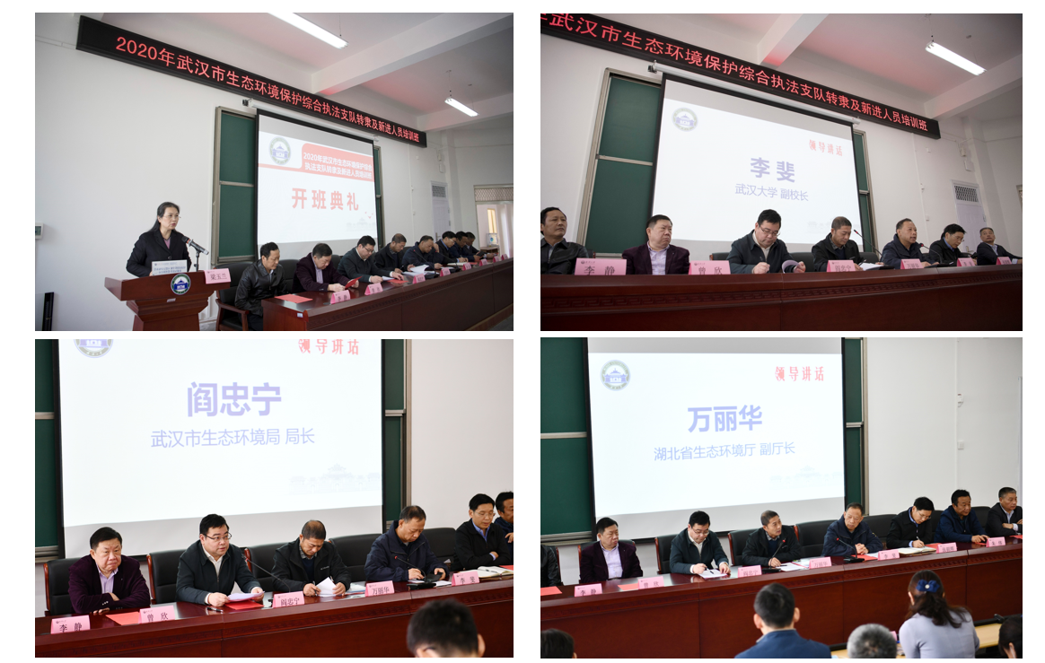 2020年10月19日,庄严的国歌声中,武汉市生态环境保护综合执法支队转隶及新进人员培训班在我校开班。澳门美高梅 副校长李斐、继续教育学院院长朱伟、澳门美高梅 书记刘兴国,湖北省生态环境厅副厅长万丽华、湖北省生态环境厅人事处二级调研员李静,武汉市生态环境局局长阎忠宁、武汉市生态环境局副局长张朝辉、武汉市生态环境保护综合执法支队支队长曾欣出席开班式。仪式由澳门美高梅 副院长梁玉兰主持。