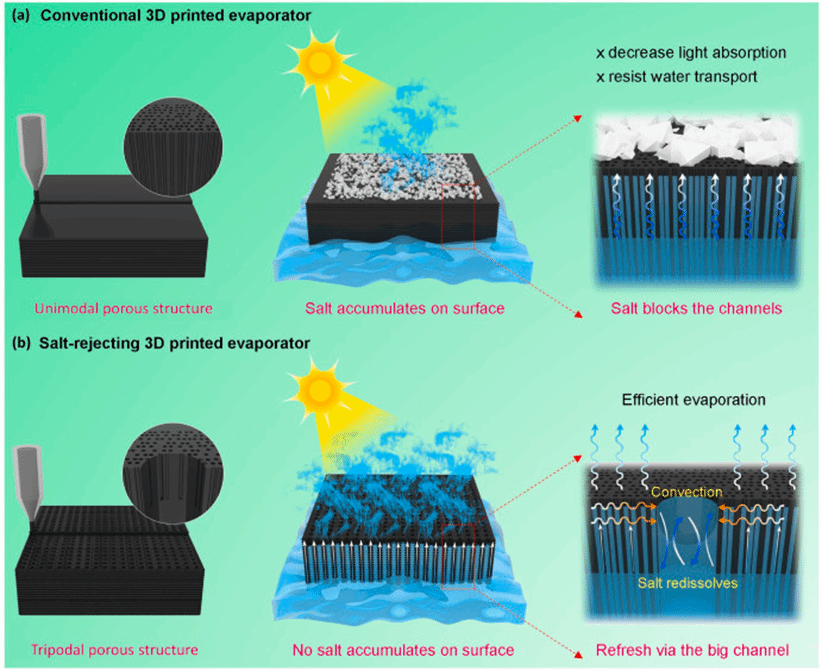 图5. 3D打印构筑人工木头结构纤维素基除盐功能太阳能蒸发器。图片来源于作者。