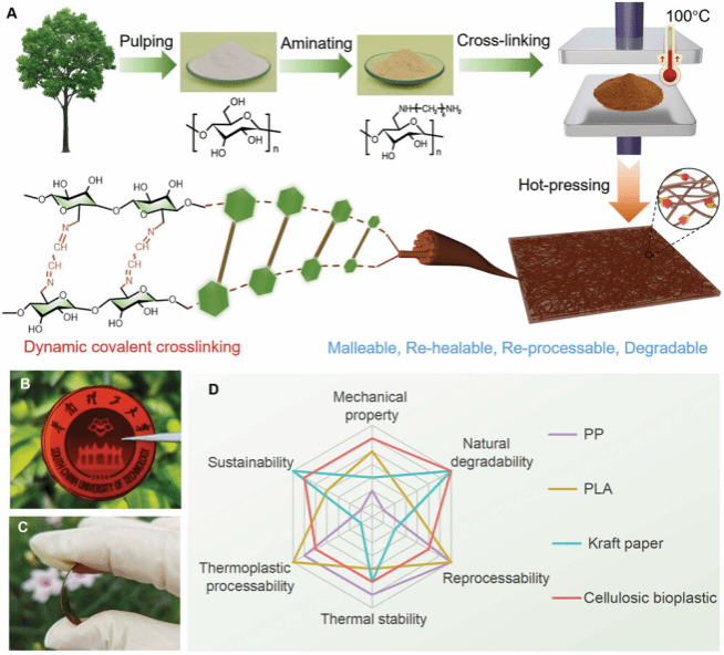 最近,课题组在可降解、可回收、可热塑性加工纤维素基生物塑料开发方面也取得新进展。课题组与华南理工大学王小慧教授团队合作,通过构建动态共价网络实现纤维素中氢键的部分解离和纤维素链的重组,从而赋予纤维素热加工性能。基于此策略,我们开发了一种可生物降解、防水和可热加工的纤维素基生物塑料。相关成果以“A Biodegradable, Waterproof, and Thermally Processable Cellulosic Bioplastic Enabled by Dynamic Covalent Modification”为题发表于期刊《Advanced Materials》,王小慧教授和陈朝吉教授为共同通讯作者。