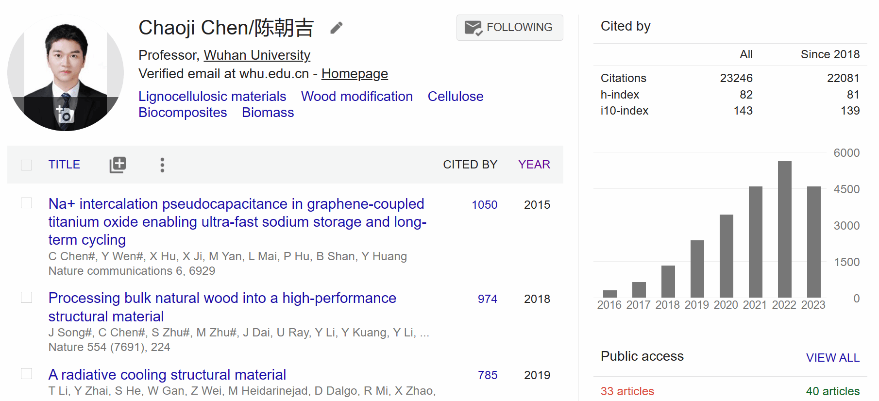 陈朝吉教授长期从事纤维素基生物质材料多尺度结构设计、功能化及可持续应用研究,致力于以天然材料解决可持续发展面临的材料-能源-环境问题,相关研究成果以第一/通讯作者(含共同贡献)于Nature、Science、Nature Reviews Materials、Nature Sustainability等国内外学术期刊发表100余篇,被相关领域学者引用23000余次,个人H因子82,其中35篇论文入选ESI高被引论文,11篇(曾)入选热点论文,为纤维素材料领域引用较高的青年学者。