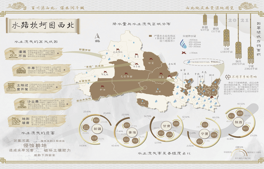 制图组一等奖作品《百川源西北,保水润千城—西北地区水资源地图集》的获奖团队由本科生沙浩和谢文析组成,黄丽娜担任指导老师。作品选题为中国西北地区水资源,从西北地区的水资源现状与发展出发,从水系流域分布、水资源格局、缺水问题、水利工程、生态建设五个方面介绍西北水环境的发展状况,使读者了解近年来西北地区开发战略的阶段性成果、水资源保护的艰苦奋斗、以及水土治理的宏伟历程。