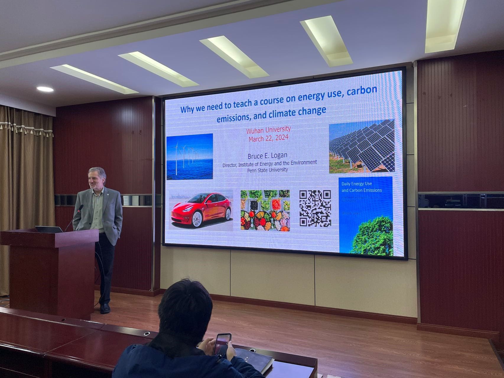 3月22日,Bruce Logan教授在学院的220报告厅进行了关于《Why we need to teach a course on energy use, carbon emissions, and climate change》的讲座。他指出,气候变化的应对是本世纪最大的环境挑战之一,但大多数人对日常生活的能源消耗和二氧化碳排放的了解十分有限。Bruce Logan教授在讲座中介绍了他在宾夕法尼亚州立大学教授的一门课程,该课程将碳排放度量化,将日常活动中的能源使用与碳排放关联起来,使人们更了解这些活动对气候变化的影响。Bruce Logan教授认为,这门课程可以提高大家对温室气体排放水平的认识,从而为解决气候变化问题作出贡献。