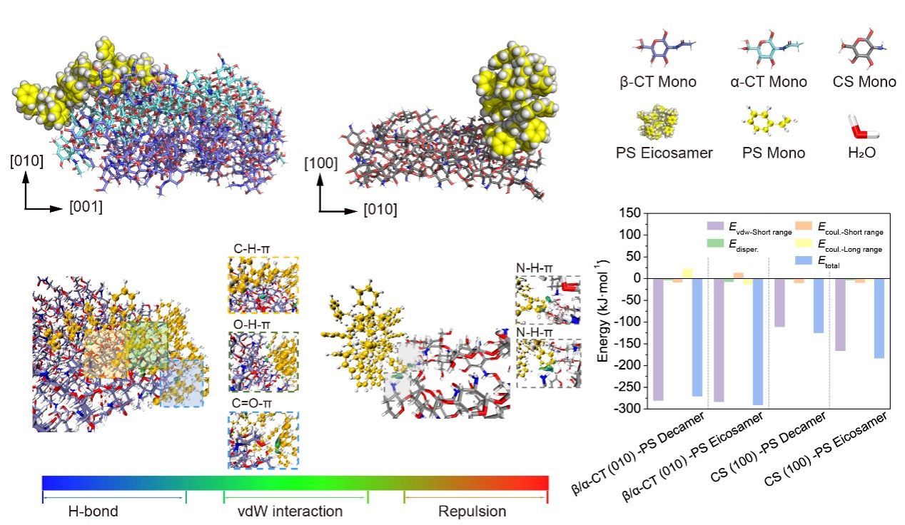 为了探究甲壳素海绵的吸附机制,该工作对比了甲壳素与壳聚糖海绵(CS)的吸附能力。壳聚糖是甲壳素的脱乙酰产物,通常被认为比甲壳素更具活性,因为其带有更多的氨基,带电荷性也更强。然而,我们的实验结果表明,在同等条件下,甲壳素海绵对微塑料的吸附能力是壳聚糖海绵的几乎三倍。分子动力学和IGM模拟辅助分析发现甲壳素与聚苯乙烯的结合能要明显高于壳聚糖,而这种高的结合能主要来源于C-H-π/ O-H-π/C=O-π相互作用,表明甲壳素上的乙酰氨基发挥了非常重要的作用(图3)。该工作在开发具有新型吸附机理和优异吸附能力的生物质吸附材料方面取得了进展,可为水环境中高风险、强隐匿的小尺度微塑料去除提供思路。