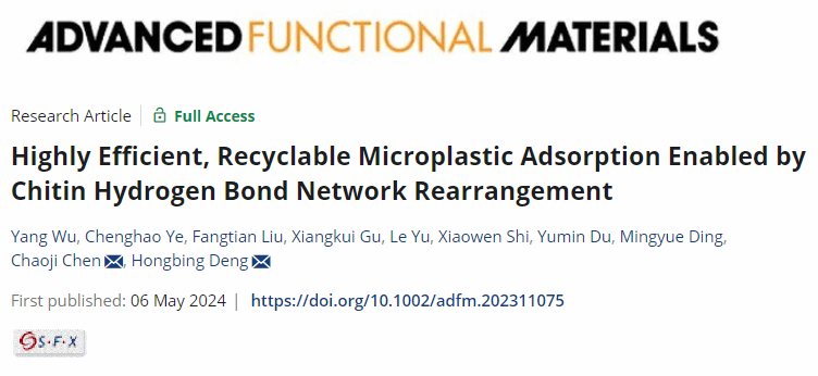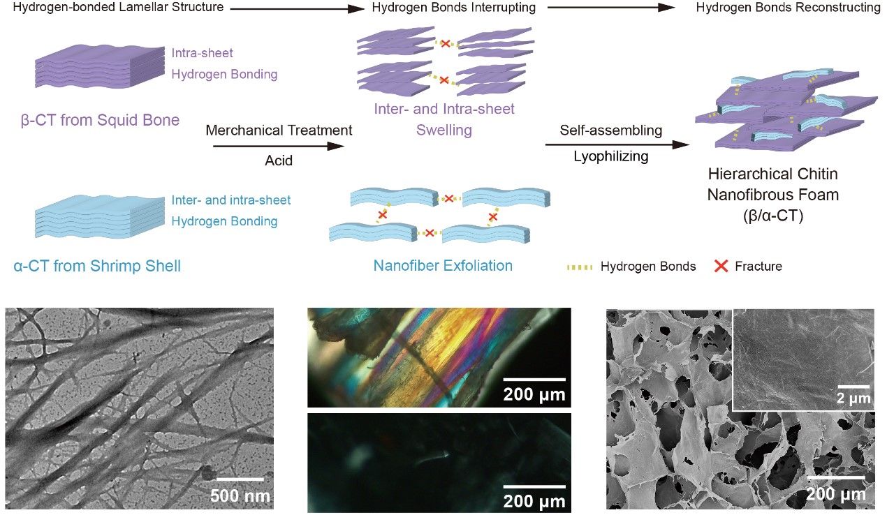 近期,澳门美高梅 邓红兵教授/陈朝吉教授团队提出了一种自上而下的甲壳素“氢键诱导重排”策略(图1),以具有两种不同原生氢键网络的α-甲壳素和β-甲壳素为原料,诱导其原生氢键网络断裂再彼此重建,两步快速构建了纯甲壳素纳米纤维海绵(β/α-CT)用于水中小尺寸微塑料的高效去除。该工作以“Highly Efficient, Recyclable Microplastic Adsorption Enabled by Chitin Hydrogen Bond Network Rearrangement”为题发表在《Advanced Functional Materials》上,文章共同第一作者是澳门美高梅 博士后吴洋和博士生叶成濠。该研究得到国家自然科学基金委、湖北省重点研发计划项目和中央高校基本科研业务费专项资金项目的支持。