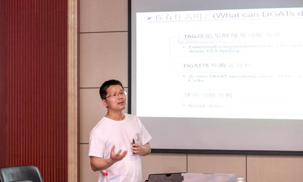 在此基础上,刘老师又讲解了藻类油脂生物合成途径,以及操控DGAT酶在代谢中的作用。通过操纵DGAT可以提高甘油三酯的含量,而后合成EPA,同时提高EPA的比重,增加高值产物的产量。此外,刘老师指出,关于藻类DGAT研究主要考虑几个问题,包括“你是谁”(即生物信息学分析),“你有什么用”(即功能互补、体外以及体内功能分析),“你从哪儿来”(即微藻种类和亚细胞定位研究)和“你要去哪儿”(即过表达/异源表达、工程应用)。