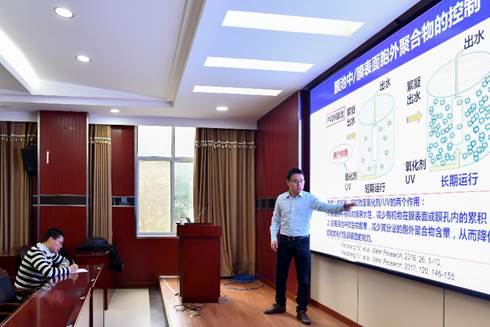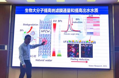 接着,俞文正研究员系统介绍了对地表生物大分子在水处理中影响的研究方法。通过考察水中生物聚合物的生化与物化特征,来探索生物聚合物在地表水净化过程中发挥的积极作用和有益特性;通过收集不同季节的典型地表水样品,提取、浓缩大分子生物聚合物,或者通过培养微生物,提取其分泌的胞外聚合物,来研究胞外聚合物对饮用水处理各工艺的影响。研究通过对生物聚合物的有益性进行系统论证,探索纳滤膜抗污染能力和出水水质对其调控变化的响应机制,考察其提高混凝效率和强化吸附典型金属粒子的效能,从而额外提升水质安全性。