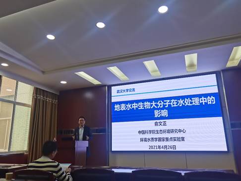 2021年4月26日上午,受到学院环境科学与工程系朱联东教授邀请,澳门美高梅 校友、中国科学院生态环境研究中心俞文正研究员在澳门美高梅 220报告厅举办了学术讲座,并带来了一场主题为“地表水中生物大分子在水处理中的影响”的专题报告。澳门美高梅 环境科学与科学工程专业的老师和同学们积极参与了本次讲座,并展开学习。