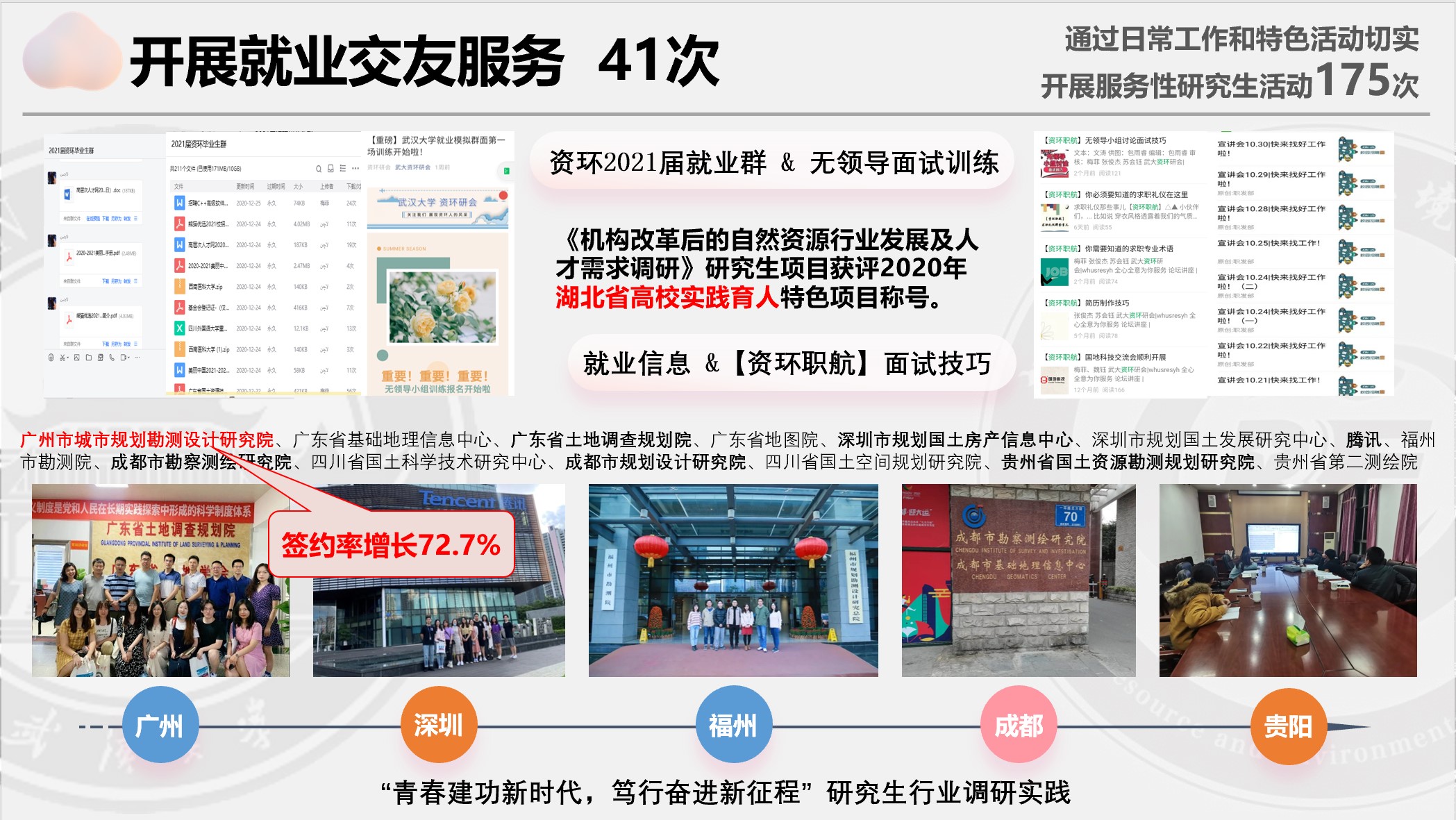 开展校园文化服务19次。举办首届元旦晚会,首届师生羽毛球赛。参加文体赛事,男篮获亚军,女篮精神文明奖,集体舞获二等奖、最佳人气奖,羽毛球女单第三女双第五;开展就业交友服务41次。创办首届行业调研活动,已前往广州站、深圳站等五地14家单位进行实地调研,撰写调研报告供全院参考。其中澳门美高梅 就业优选单位广勘院,今年签约率增长72.7%。还结合学院研究生需求特点开展了地产主题、秋招主题、选调生主题的就业交流论坛。