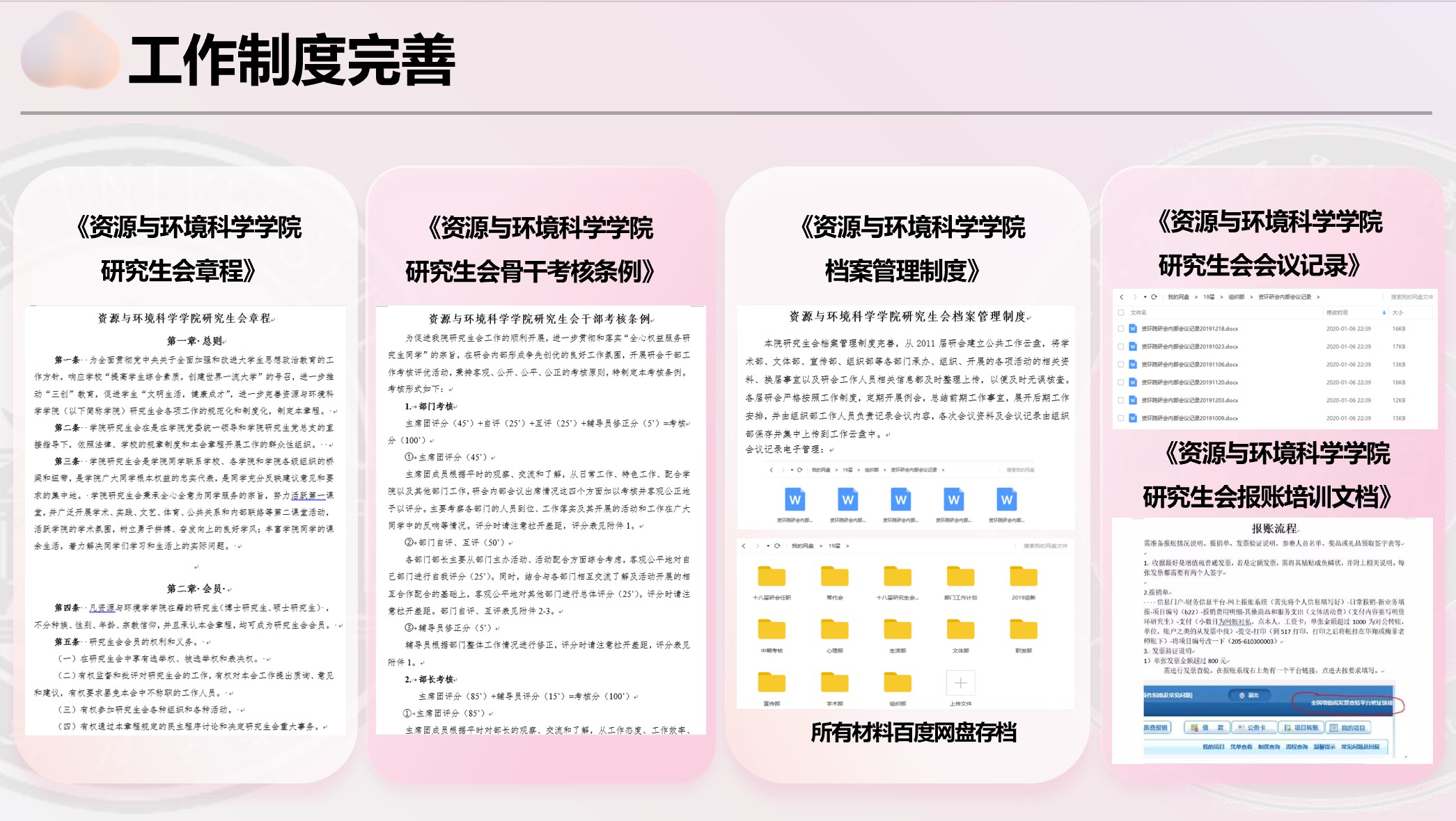 2021年4月12日,本次“优秀研究生会”评比工作正式拉开帷幕。在学院领导老师的高度重视和全力支持下,研会全体成员团结协作,最终将一年的工作整理形成14万余字的支撑材料,浓缩了资环研会全体成员的汗水与心血;在培养单位调研中,澳门美高梅 研会积极配合调研组发布线上调查问卷,并筹办接待实地走访座谈调研。调研中,就参评期内的工作进行了简要介绍,同时与调研组成员深入交流了工作经验,调研会沟通到位、气氛融洽,收获了调研组的一致好评。最终,澳门美高梅 成功进入答辩评审环节。