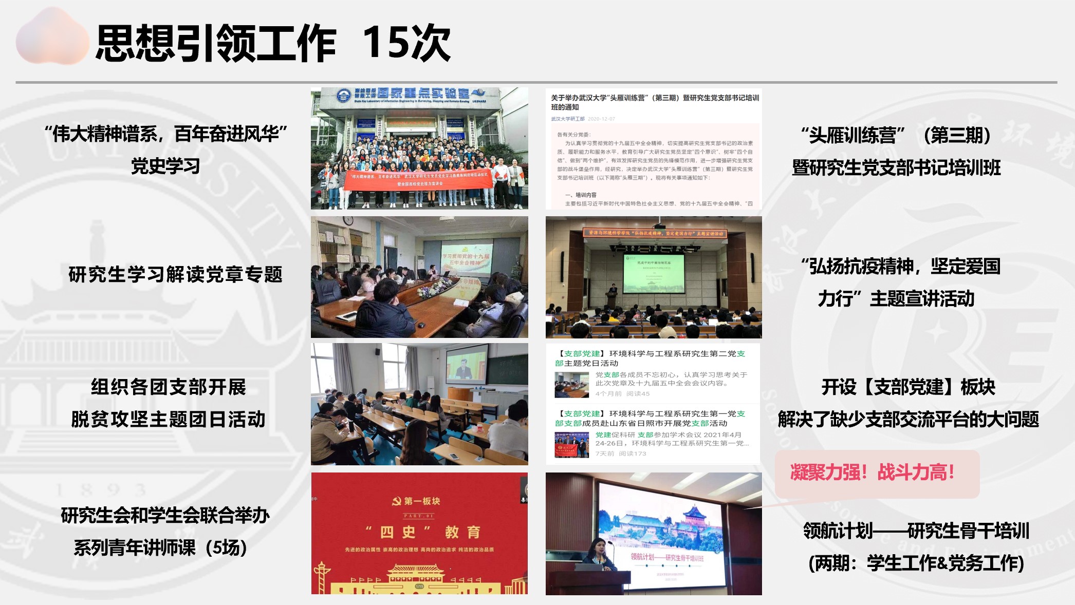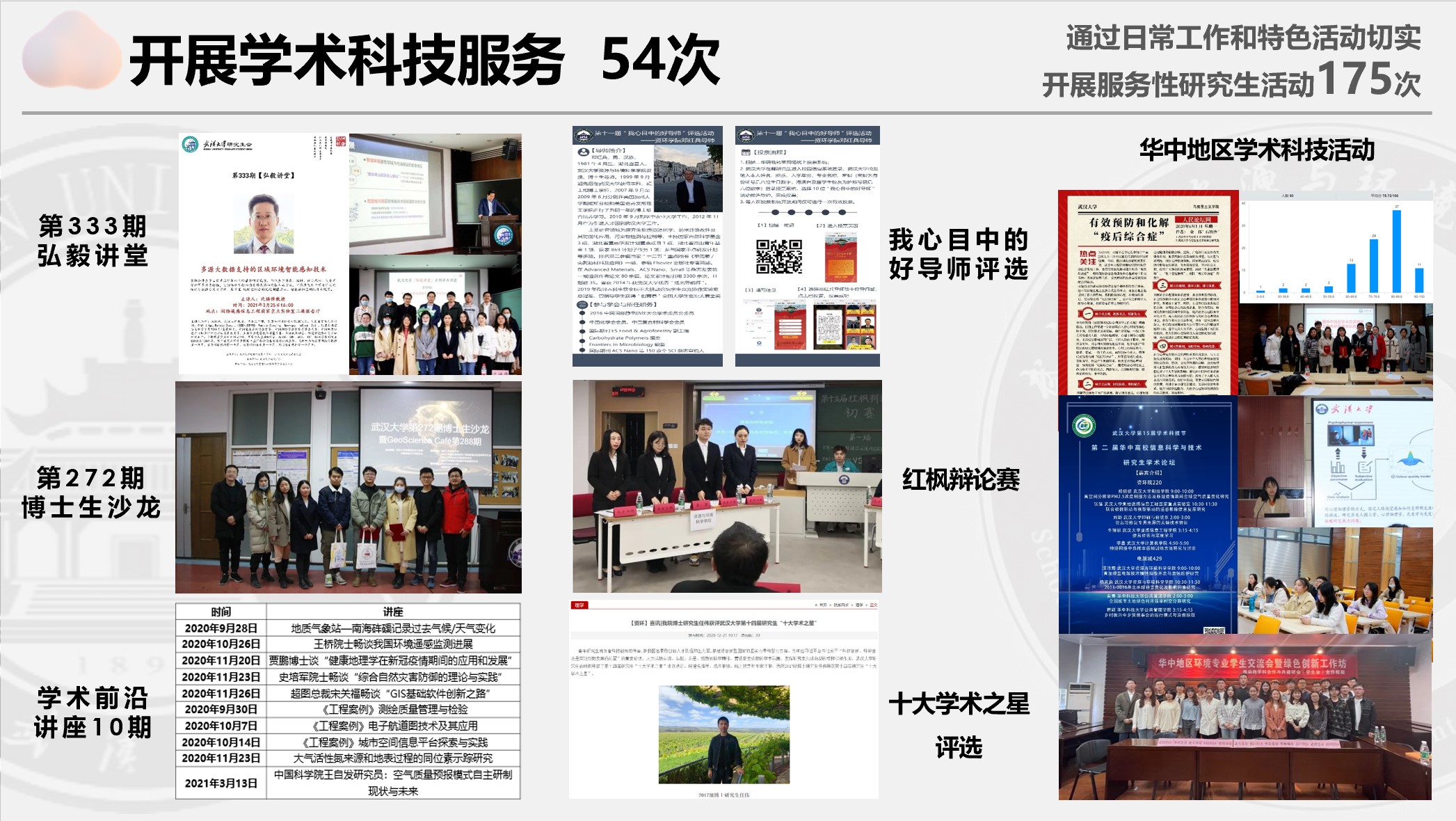 通过日常工作结合特色活动开展切实服务175次,较去年新增首届活动41场,开展正能量及活动宣传600次,向校级以上投稿120篇;开展心理健康服务18次。其中心理团辅解压活动近50名硕博士参与,全员反馈期待下一次这样的活动;开展生活权益服务28次。开展首届院领导接待学生权益日,面对面解决学生问题。延续冬至包饺子等暖心活动,举办首届最美宿舍评选和最美实验室评选,维护好研究生两个家;开展学术科技服务28次。思源论坛传承至第98期,珞珈资源环境讲坛至51期。打造“扬帆计划”活动品牌(科研素养训练营、工程实践案例交流坊)。承办弘毅讲堂,博士生沙龙,获评好导师优秀组织单位,获评学术之星,在学术科技节中立项12项。