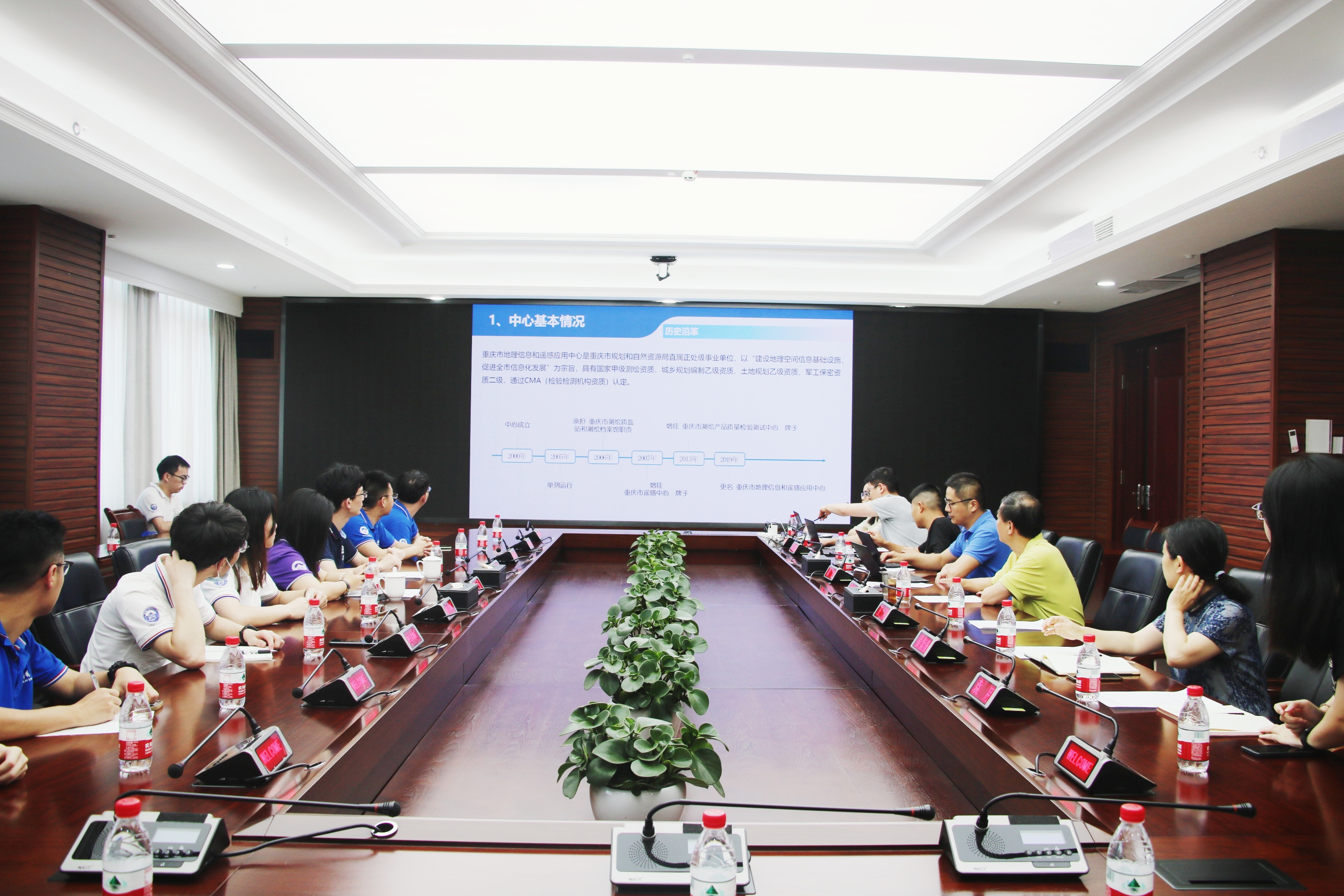 7月14日,调研团队来到了重庆市地理信息和遥感应用中心。澳门美高梅 团委副书记梅菲、测绘学院学生工作办公室副主任迟宗宝、重庆市地理信息和遥感应用中心党委书记、副主任曾安明、综合部主任王岚、软件工程和研发所所长梁星、综合部副主任姜紫薇、软件工程和研发所智慧城市产品设计部部长刘洪波、遥感智能研发部部长李朋龙、综合部人事干部袁月出席本次调研实践座谈会。