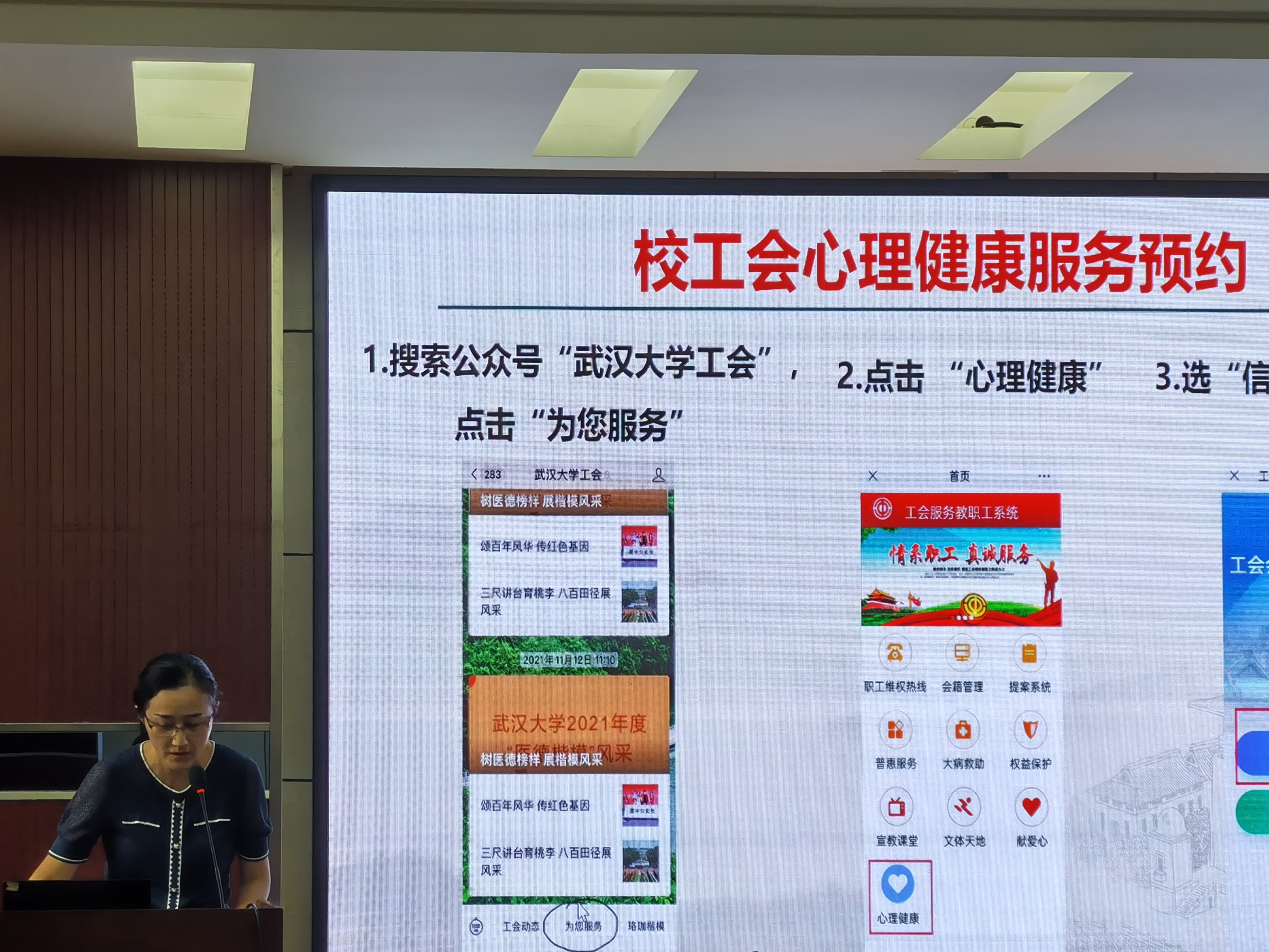 章主任的培训结束后,马书记补充介绍了校工会的心理健康服务。校工会给全体工会会员提供了心理咨询服务,对于夫妻关系、亲子关系等问题,都可以进行预约咨询。马书记简要介绍了预约流程,建议老师们可以利用校工会资源,关注自身心理健康,及时解决心理困惑。