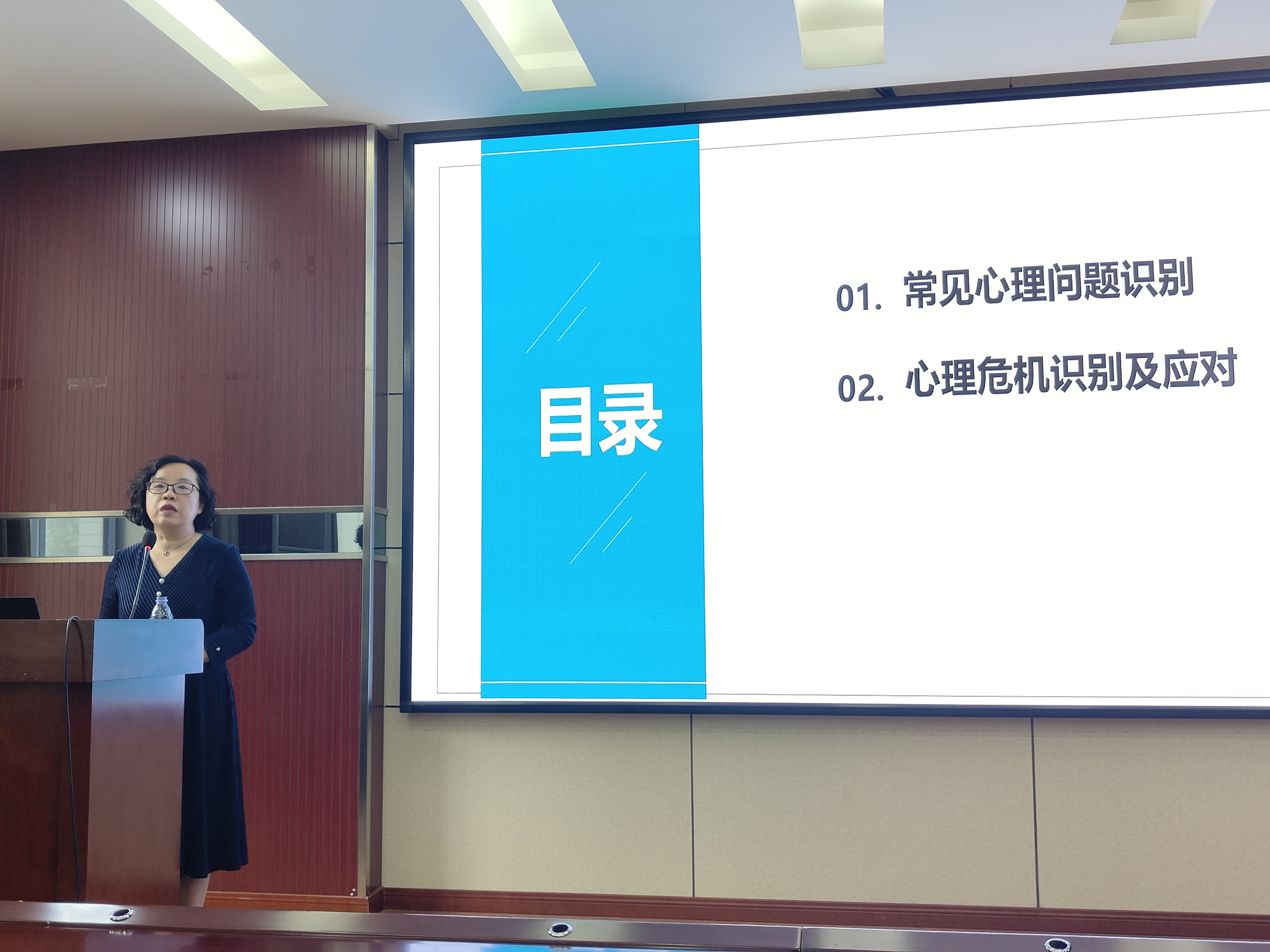 章主任就心理危机识别及应对进行了细致讲解,通过案例剖析,她分析了常见心理障碍(如神经症、抑郁症)和重性精神障碍的形成原因和症状表现,梳理出情绪、行为和情境三大识别心理危机的线索,列出了老师们需要重点关注的情况,给出了老师们进行危机干预的行动建议,介绍了学校心理中心的心理服务资源。章主任还提醒老师们可以从日常相处中关注学生的情绪变化,及时提供情绪疏导与相关帮助。“得到生活喜悦,才会关怀学生。” 最后,章主任祝愿老师们拥有美好的生活状态,与学生形成良好的师生互动关系。