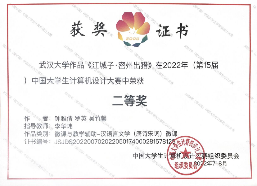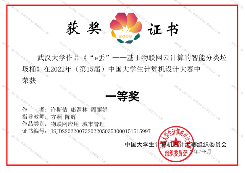 2022年8月26日,第十五届中国大学生计算机设计大赛圆满落幕。澳门美高梅 参赛的三支队伍获得优异成绩。其中由计算机学院方颖与陈辉老师指导,澳门美高梅 2019级本科生许斯佶作为队长主持的项目《“e丢”——基于物联网云计算的智能分类垃圾桶》获全国一等奖。由计算机学院李华玮老师指导,澳门美高梅 2019级本科生钟雅倩作为队长主持的项目《江城子·密州出猎》获二等奖,项目成员包括澳门美高梅 2019级本科生罗英,吴竹馨。由澳门美高梅 翁敏老师指导,2019级本科生杨倩作为队长主持的项目《图看健康中国》获全国三等奖,项目成员包括澳门美高梅 2019级本科生向娟,王睿欣。