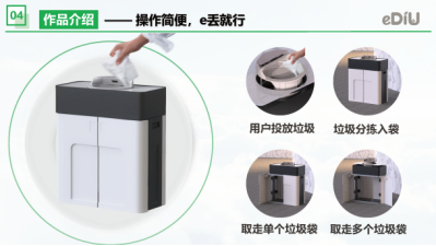 为解决垃圾分类细则繁多复杂、定时定点投放费时费力的问题,针对目前同类产品成本高昂、自动化程度不高的问题,“e丢”智能分类垃圾桶通过独到创新的硬件设计以及云端算法,大大降低了产品的成本,同时改进了Efficient-NetV2网络模型,提高了垃圾分类的准确率,对比于市场上其他现有的产品,“e丢”智能分类垃圾桶投放时间显著减少,成本上也有显著优势,目前产品正在进行量产计划的推进,希望在不久的将来能够在全国推广“e丢”智能分类垃圾桶,与一定数量的政府达成合作,从而切实帮助垃圾分类政策的推行。