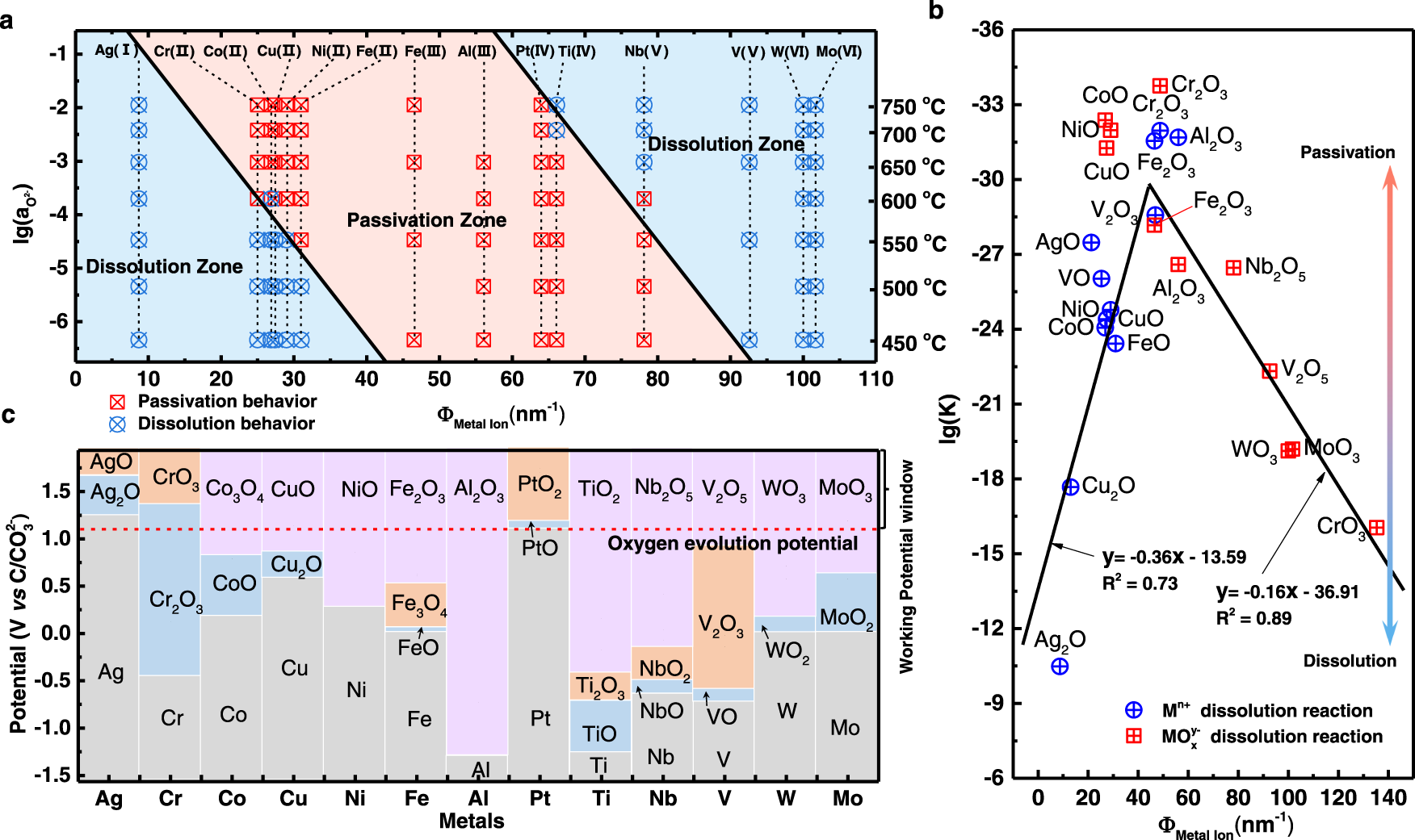 图1. a金属阳离子的离子势及熔盐酸碱度与金属材料阳极行为的关系图,b金属氧化物溶解反应平衡常数与金属阳离子离子势关系图,c金属氧化物的生成及稳定电位区间图。